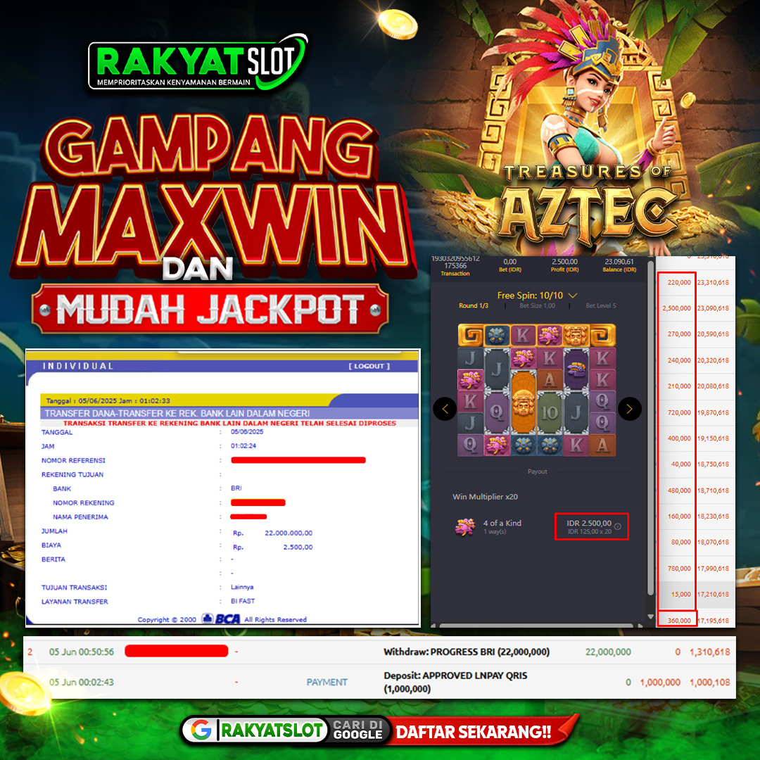 Keunggulan situs RAKYATSLOT sebagai tempat bermain slot gacor benar-benar terbukti dari pengalaman member satu ini. Tidak hanya memberikan peluang menang besar, tapi juga menjamin kenyamanan dan kecepatan dalam proses transaksi. FIR**20*IR melakukan withdrawal Rp 2,2 juta dan dana langsung masuk ke rekening dalam waktu kurang dari 5 menit, tanpa potongan dan tanpa ribet.