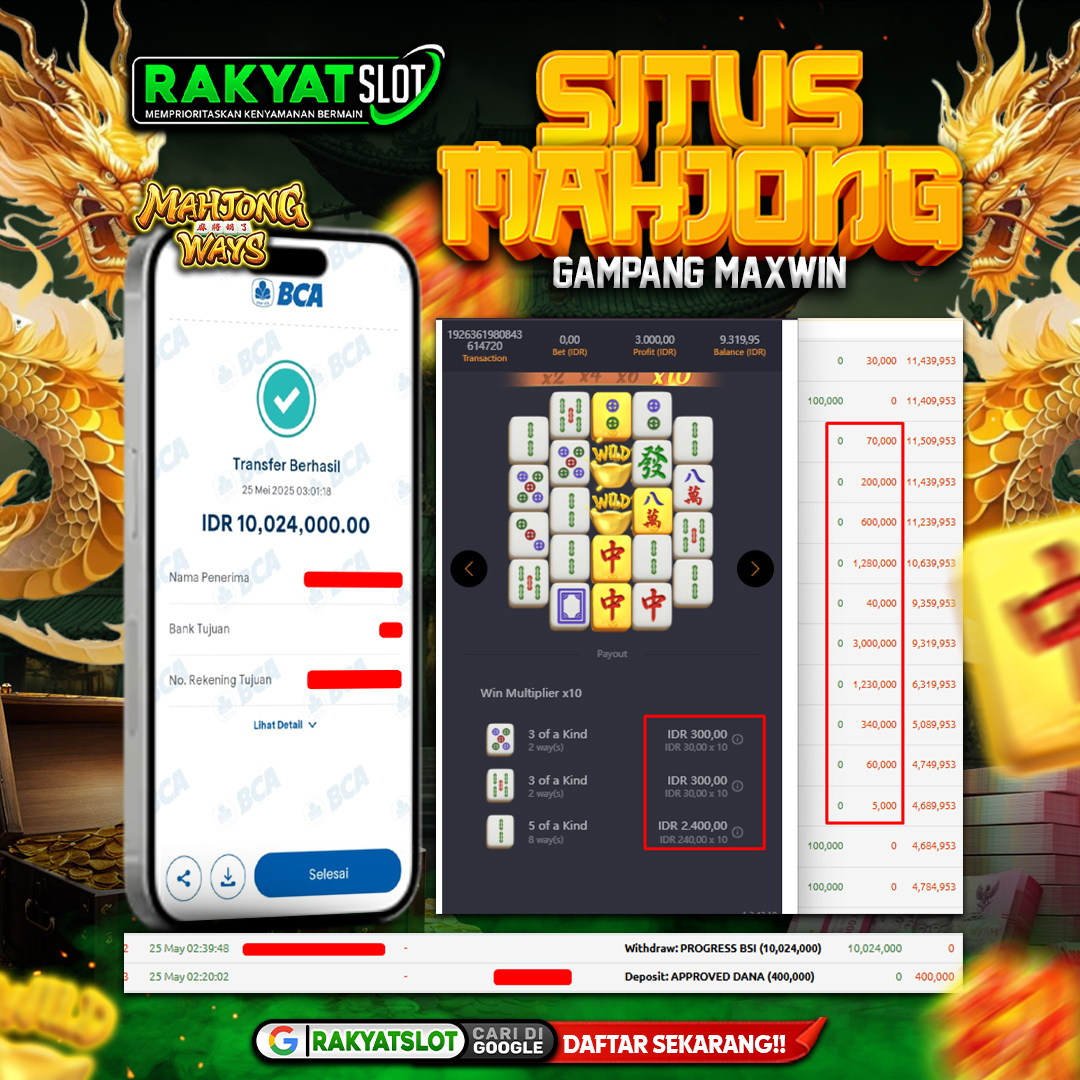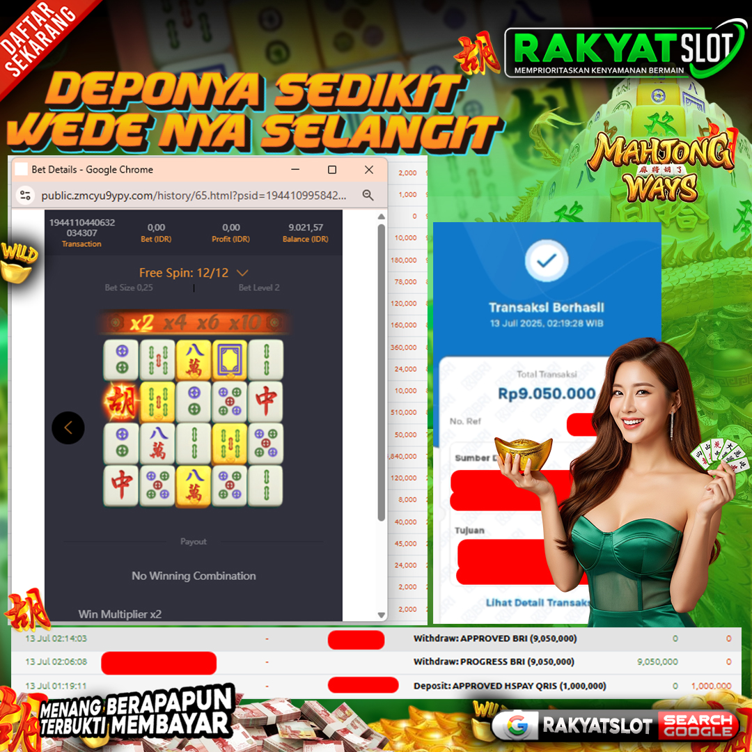 Kabar menggembirakan datang dari salah satu member setia RAKYATSLOT dengan ID Sya***. Bermodalkan Rp 5,000,000, ia berhasil meraih hasil fantastis hingga Rp 35,000,000 dari permainan populer Slots Mahjong Ways. Kisah inspiratif ini kembali membuktikan bahwa permainan di RAKYATSLOT mampu menghadirkan pengalaman seru dan penuh kejutan.